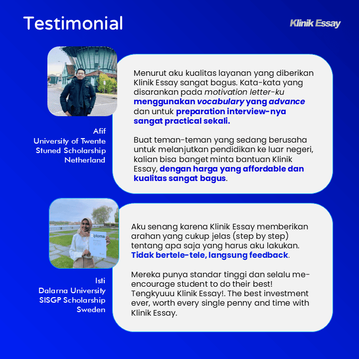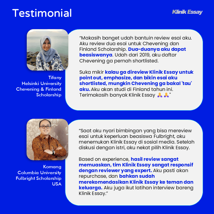 Reviewer Klinik Essay semuanya merupakan minimal lulusan universitas luar negeri world top 10, penerima beberapa beasiswa internasional, memiliki IELTS 7+, dan yang paling pasti semuanya punya passion yang sama dalam menulis dan membantu murid untuk menulis esai terbaik.
